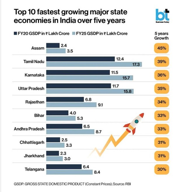 India’s per capita GDP in USD in 2025-26 is expected to be about USD 3000, which is the lower-middle income category. The data in Figure 1 suggest that no Indian state is currently in the high-income category. Only one state, Bihar, is in the low-income category. With a more Vikas-oriented government being formed in Bihar, which is aligned with the government at the Centre, prospects are favourable for Bihar to move to the lower-middle income category in the next several years. Data in Figure 2 suggests that between FY 2020 and 2025, Bihar was among the ten fastest-growing states in the country. This positive record is expected to accelerate under the new state government.