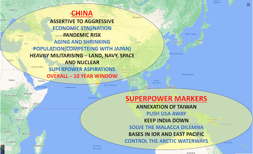 In this context it is relevant to examine China in greater detail. China has displayed assertive and aggressive tendencies to attain its superpower ambitions. However, it stands on the brink of an economic stagnation which is part structural and partly due to the prolonged pandemic risk of its Zero Covid Policy. Further, its adverse demography of falling birth rates, aging population, and decreasing work force aggravates economic stress in the long term. Views are expressed that it has peaked. Despite this, it is heavily militarising in an attempt to achieve superpower status. It is in a race against a ten-year time window to get rich before it gets old. This race to beat the time bar makes it more aggressive. The markers of its ambitions in this time window will be its attempts to militarily annex Taiwan while keeping USA out of the way. It will also attempt to keep India down using all methods. China also seeks to solve the Malacca dilemma to establish bases in the Indo-Pacific region. Very clearly, China will cause a lot of turbulence in the Indo Pacific. As it stands it has a wide footprint in the region which includes, the Solomon Islands, South China Sea, Afghanistan, Iran, Middle East, Pakistan, BRI countries, Island nations in the IOR, and the LAC along India.