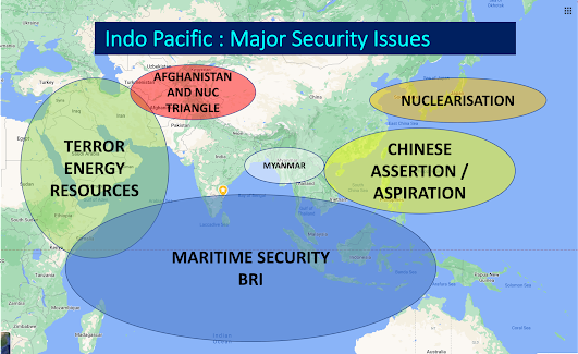 In this context, it is required to analyse the major security issues which plague the Indo-Pacific. At the very top of the list is Chinese assertion and aspirations to exert influence in the Indo-Pacific. An extension to this is the maritime security and issues connected to the BRI. At the western end of the Indo-Pacific are issues connected to terror and energy resources of the middle east. Iran, Afghanistan and the nuclear triangle of Pakistan- India and China also cast their shadow on the Indo-Pacific. At the centre is the crisis ridden Myanmar. Finally increased talk of nuclearization of South Korea and Japan because of the Ukrainian crisis has just started to roll out. It will compound issues. Overall, the Indo-Pacific has a handful of security problems.