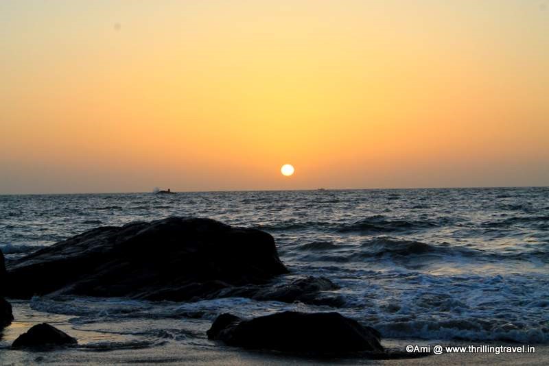 I suppose, I expected a beach approach just like Goa – where we could just walk onto the Sandy beach. Instead it was a pleasant trek down onto a sandy but rocky beach. The rocks amidst the waves was a perfect spot to perch yourself on and experience the gush of water around you. With the sunset lighting up the water and the rocks, Kudle beach turned into a photographer’s paradise.