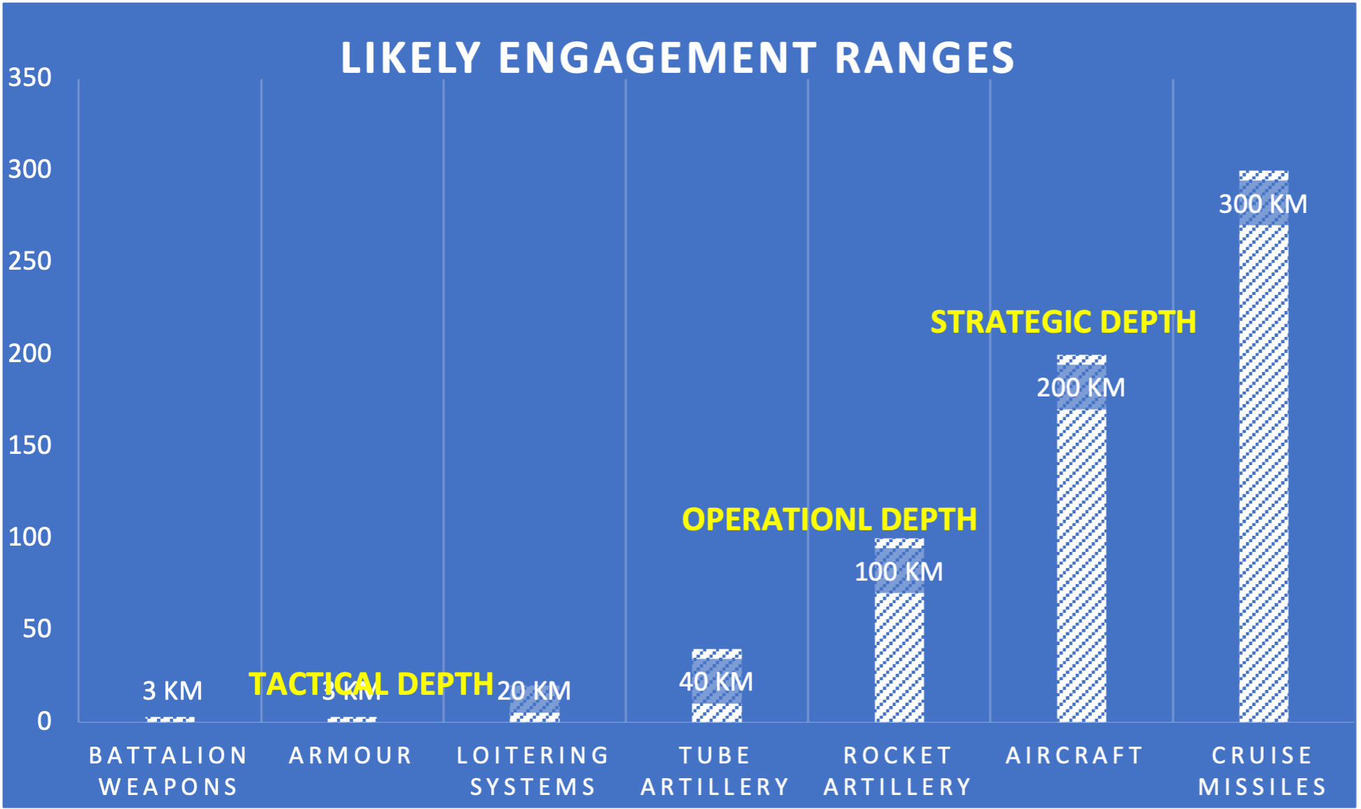 In any theatre of operations, in the tactical, operational and strategic depths, firepower will be used for posturing and muscle flexing constantly. The likely engagement ranges (in Kilometers) of the firepower spectrum are tabulated above. In the Indian context, the chances of using ground-based firepower are far greater than aerial firepower. As fighting breaks out, firepower is more likely to be applied at the tactical and operational depths. In all cases, firepower represented by the Regiment of Artillery will dominate the battlefield, in peace and war.