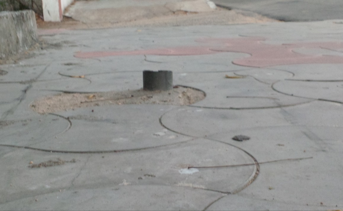 In the meanwhile, people still need space to walk, preferably without having to constantly look front, back and sides for an errant driver cannoning into them which is normally the case while using the road to walk. Not to forget that in times of heavy traffic, two wheelers tend to use the footpath as an extension of the road. Additionally, eyes on the ground is also of absolute essence as any given footpath may house objects like broken or cut poles (picture below) that could have been a road sign in its previous life, ready to trip up an unsuspecting pedestrian.