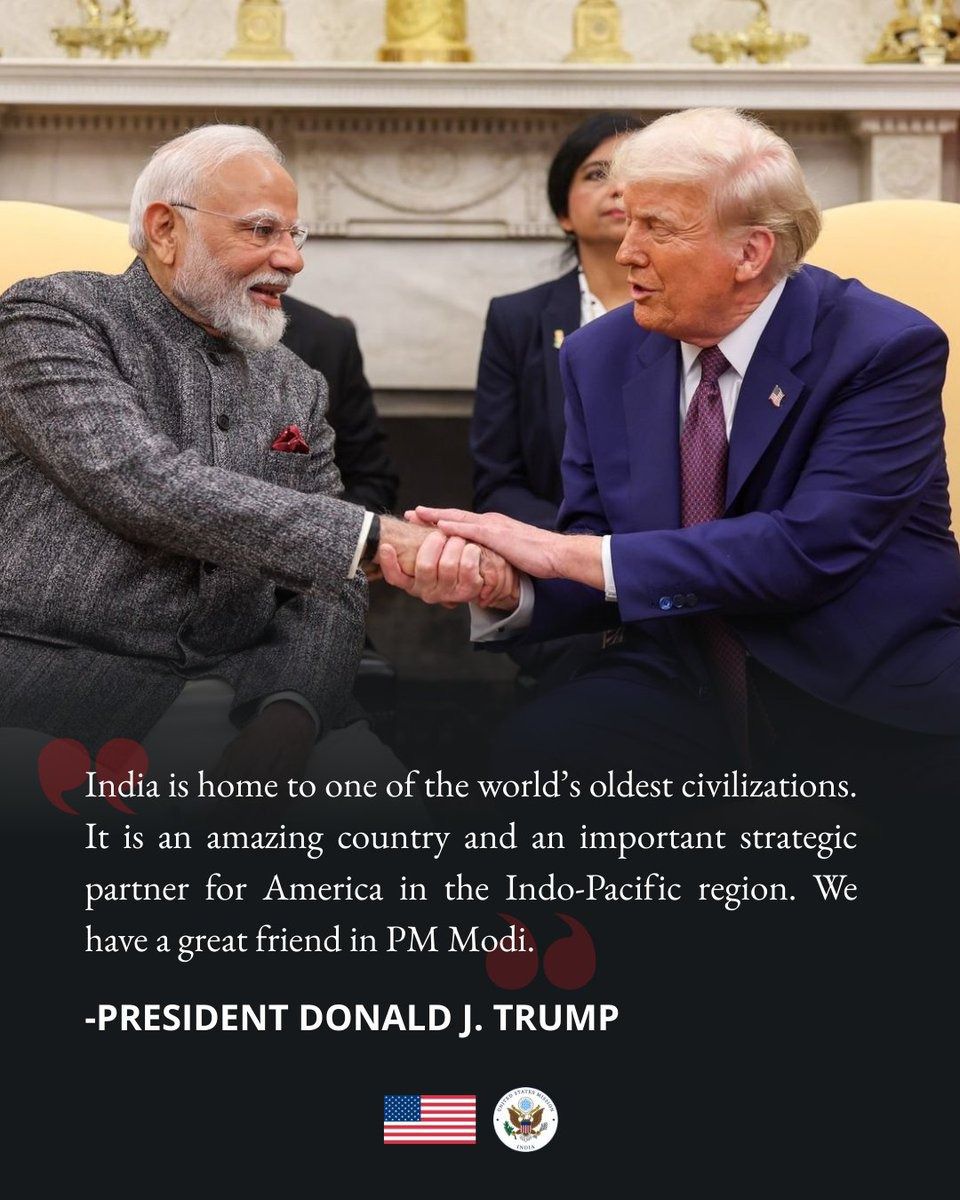 On Tuesday, the US Embassy in India posted on social media platform X (formerly Twitter) a quote from President Trump that highlighted his admiration for India and its leader. In the message, Trump said, “India is home to one of the world’s oldest civilisations. It is an amazing country and an important strategic partner for America in the Indo-Pacific region. We have a great friend in PM Modi.”