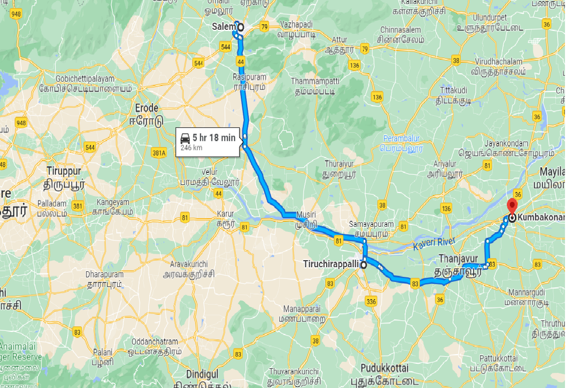One thing that I notice about Trichy is that it probably is the centre point in Tamil Nadu from wherein one can travel in many directions and in each direction, one can find temples that are steeped in culture, tradition and history - be it a Vaishnavaite or a Shaivaite or anyone else. They all are awe-inspiring and are divine without any doubt. And as to why I talk about Trichy in this manner, just take a look at the 2 directions in the map below: (3rd direction is towards Thirunelveli) which is more south and not visible in this map)