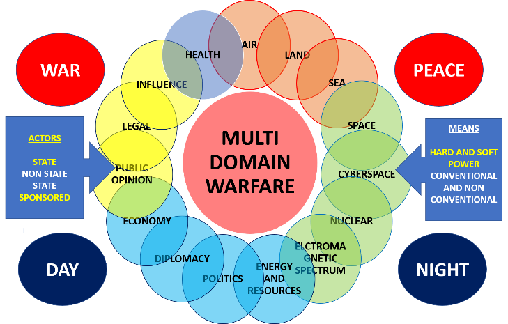 The Concept The Chinese practice the concept of ‘Unrestricted Warfare’. This led the US Army to adopt the Multi Domain Operations (MDO) approach. However, MDO is operational and too narrow when applied at a national/international level. A wider understandable concept like MDW is needed to encapsulate the dark approaches of China in conducting war. Clausewitz’s dictum that “war is politics by other means” and conversely “politics is war by other means” encapsulates the MDW spectrum. It can be defined as conventional and/or non-conventional war carried out by state, non-state or state sponsored actors using hard and soft power during war, conflict or peace situations by day or night for specified national outcomes in various interacting and overlapping domains. These multiple domains are represented in the graphic.