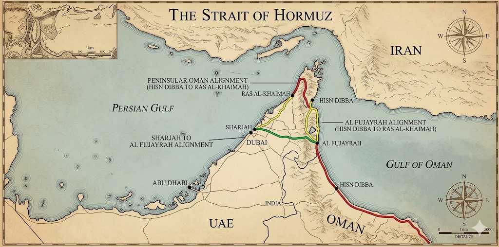 Hence, one ponders over the idea of creating a Hormuz bypass canal in the Peninsular Oman and the UAE to link the Gulf of Oman with the Persian Gulf, totally bypassing the chokepoint of the Strait of Hormuz. We have previous examples of enhancing trade connectivity and achieving significant gains in both time and economic efficiencies by creating manmade canals and waterways. The Suez Canal is a 120.1-mile-long (193.3-km) artificial sea-level waterway in Egypt, connecting the Mediterranean Sea and the Red Sea. The Panama Canal is an artificial waterway approximately 51 miles (82 kilometers) long that connects the Atlantic Ocean (via the Caribbean Sea) and the Pacific Ocean. If one studies the regional maps and geography, there are several competing candidate routes for building a man-made waterway between the Gulf of Oman and the Persian Gulf, cutting across the land while bypassing the maritime chokepoint of the Strait of Hormuz.