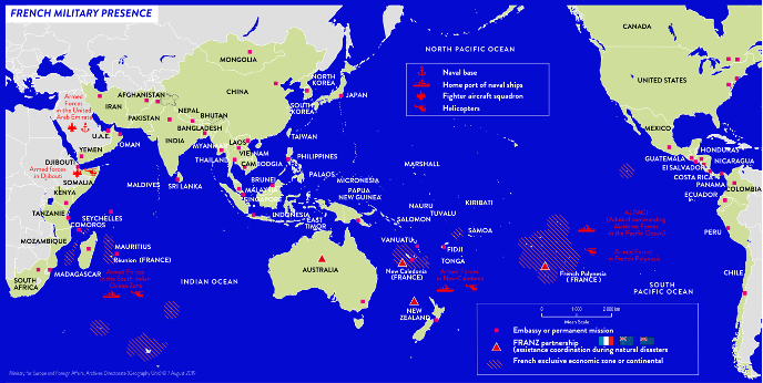 French Perspective France has large territory in this region. It includes 93% of its EEZ, 1.5 million French citizens and a military presence of 8000 troops. It has 7,000 subsidiary companies and 150,000 expatriates who are settled and trade in the area. In its view two striking regional phenomena are - increasing military assertion and global ambition of China and violent expression by Radical Islamism. It sees parts of the Indo-Pacific region in turmoil. France perceives a growing role in this region as a mediating, inclusive and stabilizing power in settlement of regional crises, protection of shipping routes, fight against terrorism, radicalization and organized crime as part of global governance. Indo-Pacific is a priority region for France. It intends to strengthen partnerships with regional players having same values and interests: Australia, India, Indonesia, Japan, New Zealand, Singapore and South Korea. It looks at a cooperative and reciprocal relationship with China, within the EU framework. It seeks increasing engagement with regional organizations (particularly ASEAN) and an inclusive Indo-Pacific space in which no country should impose its hegemony.