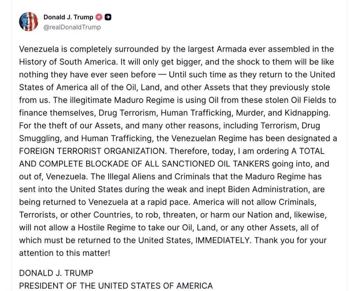 “Venezuela is completely surrounded by the largest Armada ever assembled in the History of South America. It will only get bigger, and the shock to them will be like nothing they have ever seen before. Until such time as they return to the United States of America all of the Oil, Land, and other assets that they previously stole from us.”