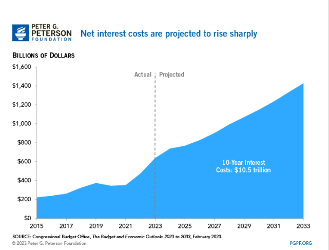 The $480B spent (last year) on net interest expenses on the debt is going to keep increasing with the Fed continuing to raise rates and/or keep them high for longer to contain inflation. This February, the Congressional Budget Office (CBO) projected that annual net interest costs would total $640 billion in 2023 $739 billion in 2024 reaching a staggering $1.4T in 2033. The nonpartisan Peter G Peterson foundation is estimating around $10.5T in interest payments over the next decade.