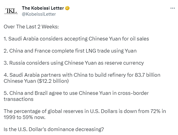 Most people are missing the woods for the trees with a large amount of focus on many nations deciding to transact in something other than USD vs the other nations not buying UST with their reserves/trade surpluses.
