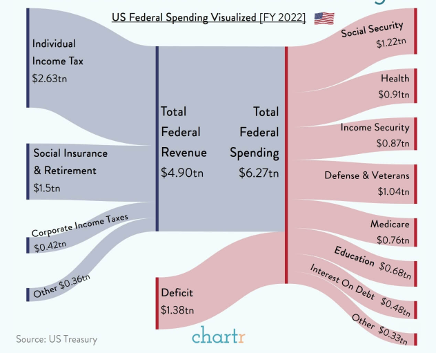 The US currently is running a $1.38T+ deficit. This shortfall forces the government to issue new even more debt every year to meet its (spending) obligations.