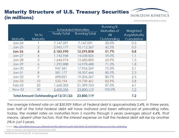 The important thing to note is that roughly half of the debt will mature in the next 3 years. If the Federal Reserve keeps rates higher to keep inflation in check, then it is bound to make the debt that needs to be refinanced that much more expensive leading to an ever-bigger debt burden.
