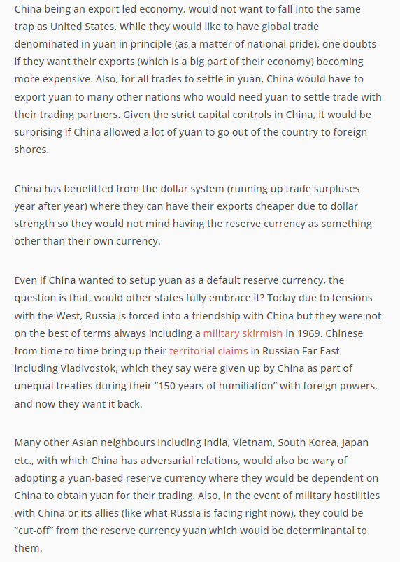 The bigger issue IMO is what do nations do with their trade surpluses? Nations will bit vary by investing them in Chinese yuan given a whole multitude of reasons that I wrote about last year.