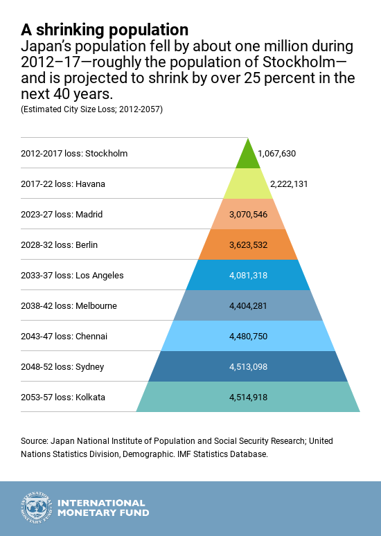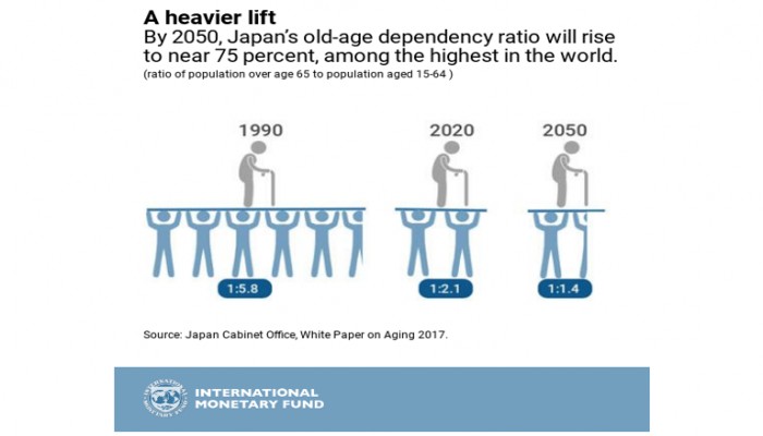 Japan has been coping with reduced number of working age persons supporting each elderly (see graph A Heavier Lift). BY 2020, only 2.1 workers will be supporting each elderly person, and this is projected to decrease to only 1.4 by 2050.