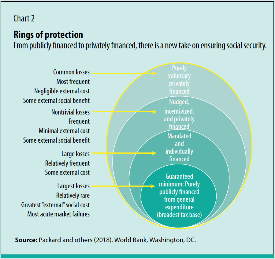 Societies as well as households need to rely on multiple sources from which financing for retirement is derived (see chart Rings of Protection)