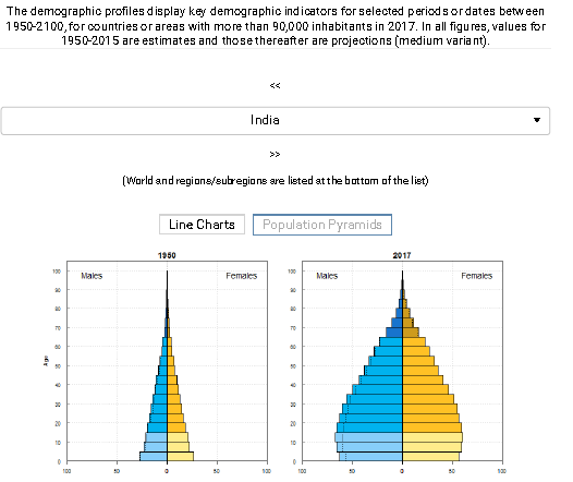 India is projected to age moderately rapidly as evidenced by the changing population profile projected since 1950 exhibited in the graph below.